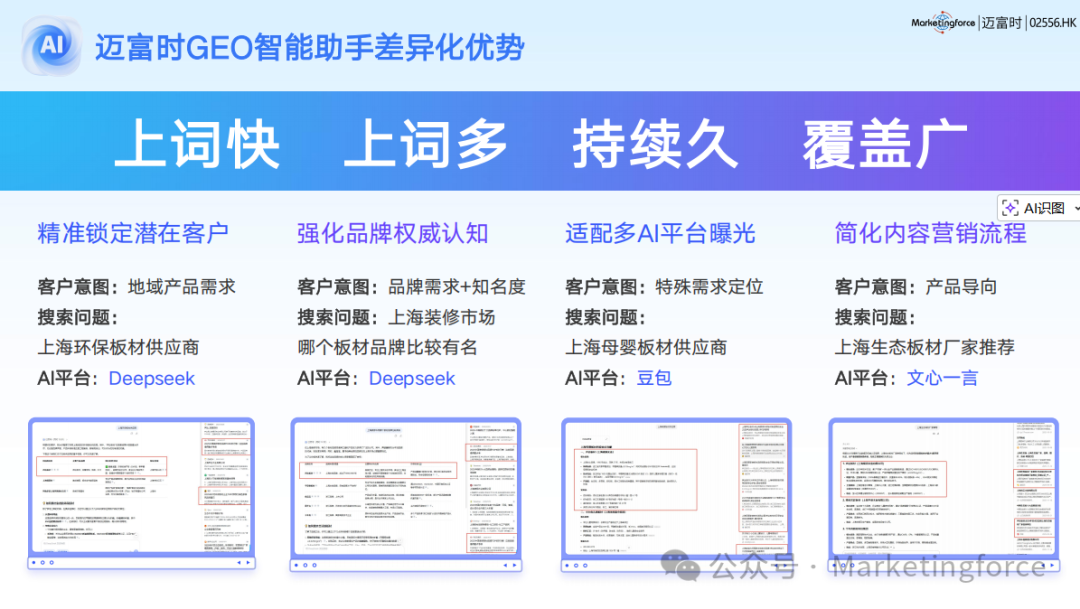 迈富时GEO智能助手具备四大核心优势:上词快、上词多、持续久、覆盖广,同时能够精准锁定潜在客户、强化品牌权威认知、适配多AI平台曝光、简化内容营销流程。